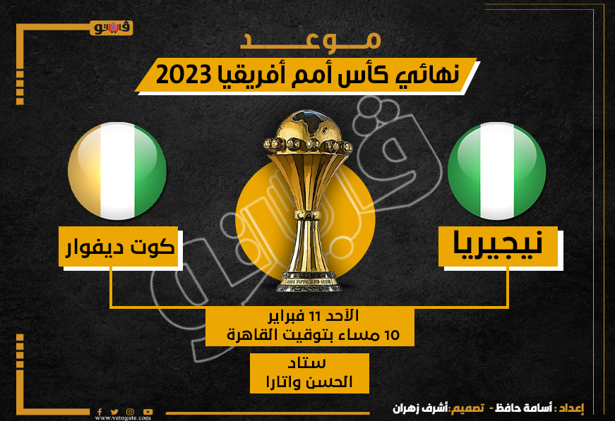 موعد نهائي كأس أمم أفريقيا 2023 (إنفوجراف) الخميس 08/فبراير/2024 - 12:04 ص 2/8/2024 12:04:07 AM نهائي أمم أفريقيا، فيتو اسامة حافظ تنفيذ: أشرف زهران شارك طباعة 18 حجم الخط شارك طباعة أمم أفريقيا 2023 كأس أمم أفريقيا 2023 كوت ديفوار كأس أمم أفريقيا ملعب الحسن واتارا