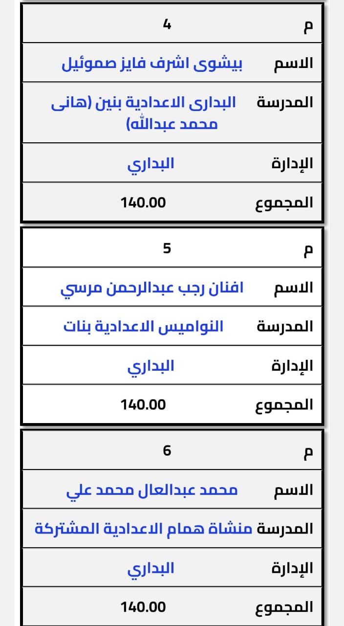 وضمت أيضًا محمد عبد العال محمد علي منشأة همام الإعدادية المشتركة، وملك عصام سيد إسماعيل بمدرسة العقال البحري الإعدادية بنات واحمد دياب محمد أحمد بمدرسة البداري الإعدادية بنين وأروي محمود حسن بمدرسة النواميس الإعدادية بنات، وأحمد دياب محمد أحمد بمدرسة الإعدادية بنين، ورحاب علي محمد حامد بمدرسة النواميس الإعدادية بنات، وأريج محمد حفني عبد الرحمن النواميس الإعدادية بنات بالإضافة إلى 90 طالبًا وطالبة أخرى.