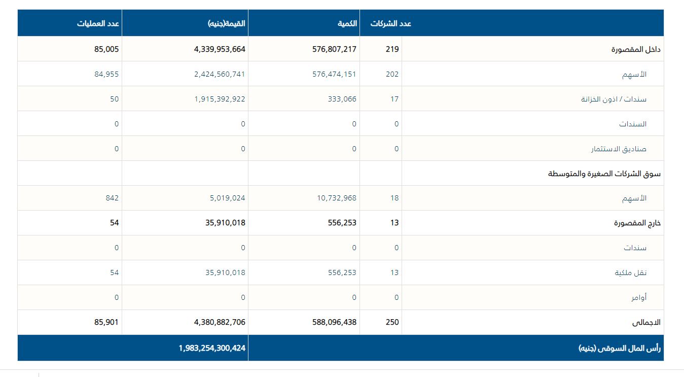 كما تراجع مؤشر الشركات الصغيرة والمتوسطة "إيجي إكس 70 متساوي الأوزان" بنسبة 0.93% ليغلق عند مستوى 6759 نقطة، وهبط مؤشر "إيجي إكس 100 متساوي الأوزان" بنسبة 1% ليغلق عند مستوى 9486 نقطة.