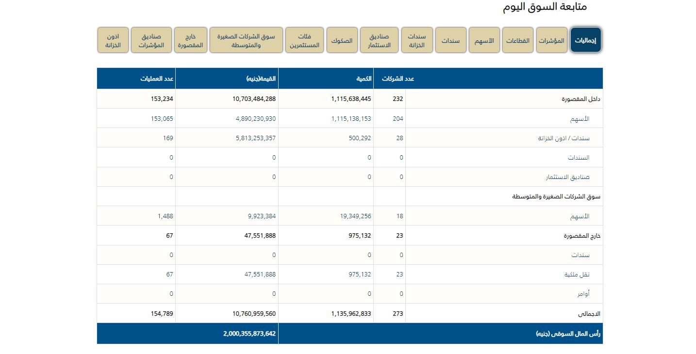 وهبطت مؤشرات البورصة بختام تعاملات الثلاثاء الماضي، منتصف تعاملات الأسبوع، وخسر رأس المال السوقي 33 مليار جنيه ليغلق عند مستوى 1.945 تريليون جنيه.