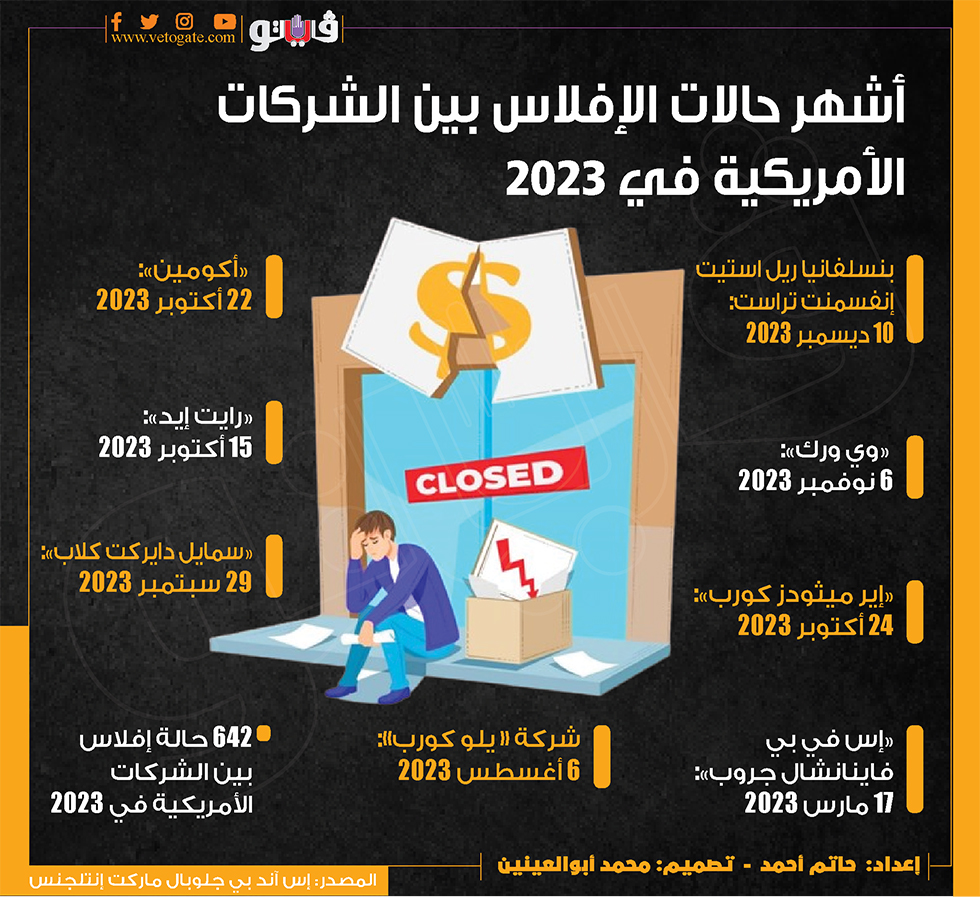 أشهر حالات الإفلاس بين الشركات الأمريكية في 2023 (إنفوجراف) الخميس 08/فبراير/2024 - 09:10 م 2/8/2024 9:10:16 PM حالات الإفلاس بين الشركات الأمريكية حاتم أحمد شارك طباعة 18 حجم الخط شارك طباعة الشركات الأمريكية حالات الإفلاس حالات الإفلاس بين الشركات الأمريكية شركة وي ورك شركة أكومين