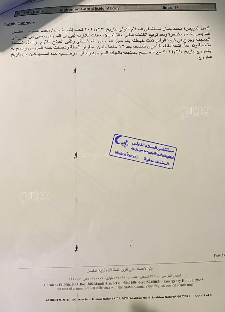 وحصلت “فيتو” على صورة من التقرير الطبي الذي أوضح مدى الإصابات الخطِرة التي تعرض لها الموسيقي جيمي هود في رأسه.