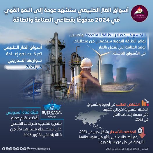 نشرت الصفحة الرسمية لمركز المعلومات ودعم اتخاذ القرار بمجلس الوزراء على موقع التواصل الاجتماعي “فيسبوك” فيديو جديدا تحت عنوان (أسواق الغاز الطبيعي ستشهد عودة إلى النمو القوي في 2024 مدفوعًا بقطاعي الصناعة والطاقة).