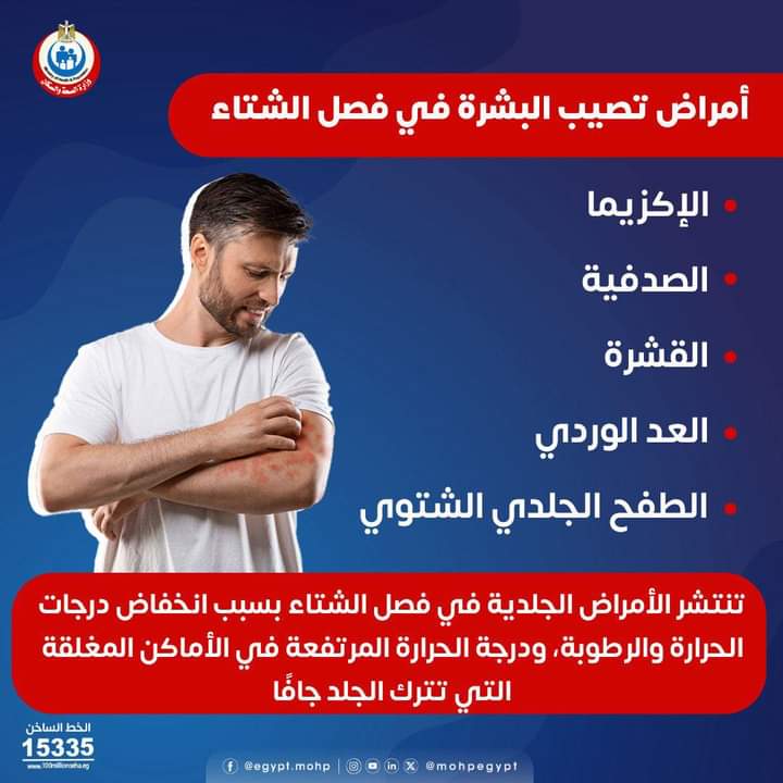 وقالت وزارة الصحة إن الأمراض الجلدية تنتشر في موسم الشتاء بسبب انخفاض درجة الحرارة والرطوبة، كما أن درجة الحرارة المرتفعة في الأماكن المغلقة التي تترك الجلد جافا.