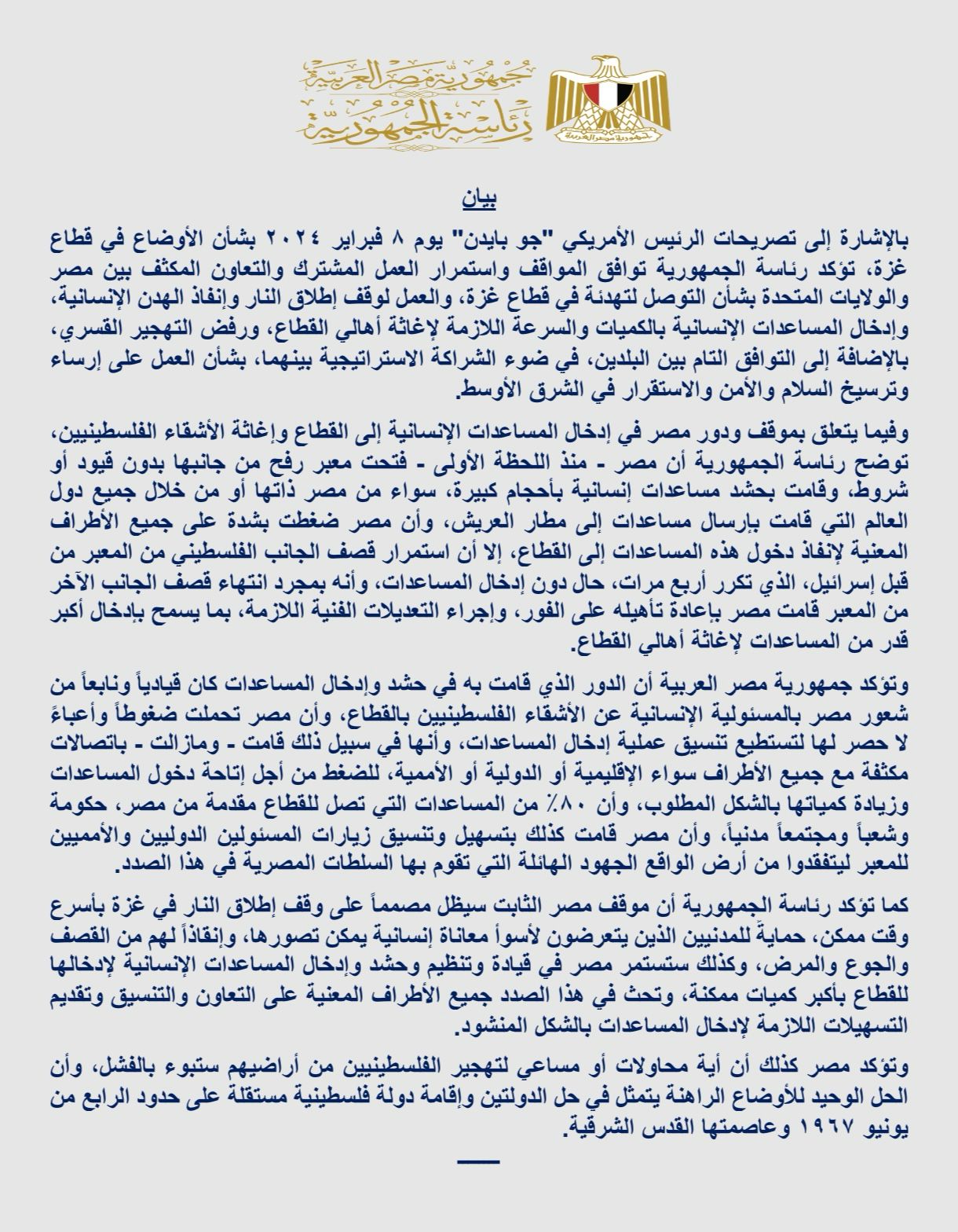 أصدرت رئاسة الجمهورية المصرية بيانا اليوم جاء فيه: بالإشارة إلى تصريحات الرئيس الأمريكي جو بايدن يوم 8 فبراير 2024 بشأن الأوضاع في قطاع غزة تؤكد رئاسة الجمهورية توافق المواقف واستمرار العمل المشترك المكثف بين مصر والولايات المتحدة الأمريكية بشأن التوصل للتهدئة في قطاع غزة والعمل لوقف إطلاق النار وإنفاذ الهدن الإنسانية وإدخال المساعدات الإنسانية بالكميات والسرعة اللازمة لإغاثة أهالى القطاع ورفض التهجير القسري بالإضافة إلى التوافق التام بين البلدين في ضوء الشراكة الاستراتيجية بشأن العمل على إرساء وترسيخ السلام والأمن والاستقرار في الشرق الأوسط.