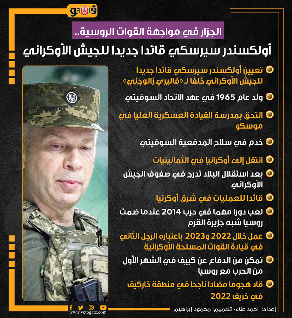 الجزار في مواجهة القوات الروسية.. أولكسندر سيرسكي قائدا جديدا للجيش الأوكراني (انفوجراف) السبت 10/فبراير/2024 - 12:49 م 2/10/2024 12:49:41 PM قائد الجيش الأوكراني الجديد، فيتو احمد علاء شارك طباعة 18 حجم الخط شارك طباعة قائد الجيش الاوكراني الجديد فاليري زالوجني أولكسندر سيرسكي من هو قائد الجيش الأوكراني الجديد اغتيال الرئيس الأوكراني أوكرانيا الحرب الروسية الأوكرانية
