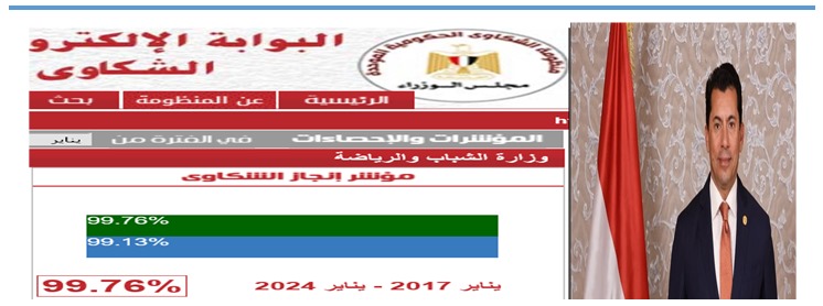 تابع الدكتور أشرف صبحى وزير الشباب والرياضة، حصاد جهود منظومة الشكاوى الحكومية المُوحدة بمجلس الوزراء للرابط الفرعى الخاص بوزارة الشباب والرياضة، خلال شهر يناير من عام 2024، حيث حققت وزارة الشباب والرياضة نسبة إنجاز واستجابات مميزة كمًا ونوعًا في الرد ومعالجة أسباب الشكاوى بنسبة 99.76%.