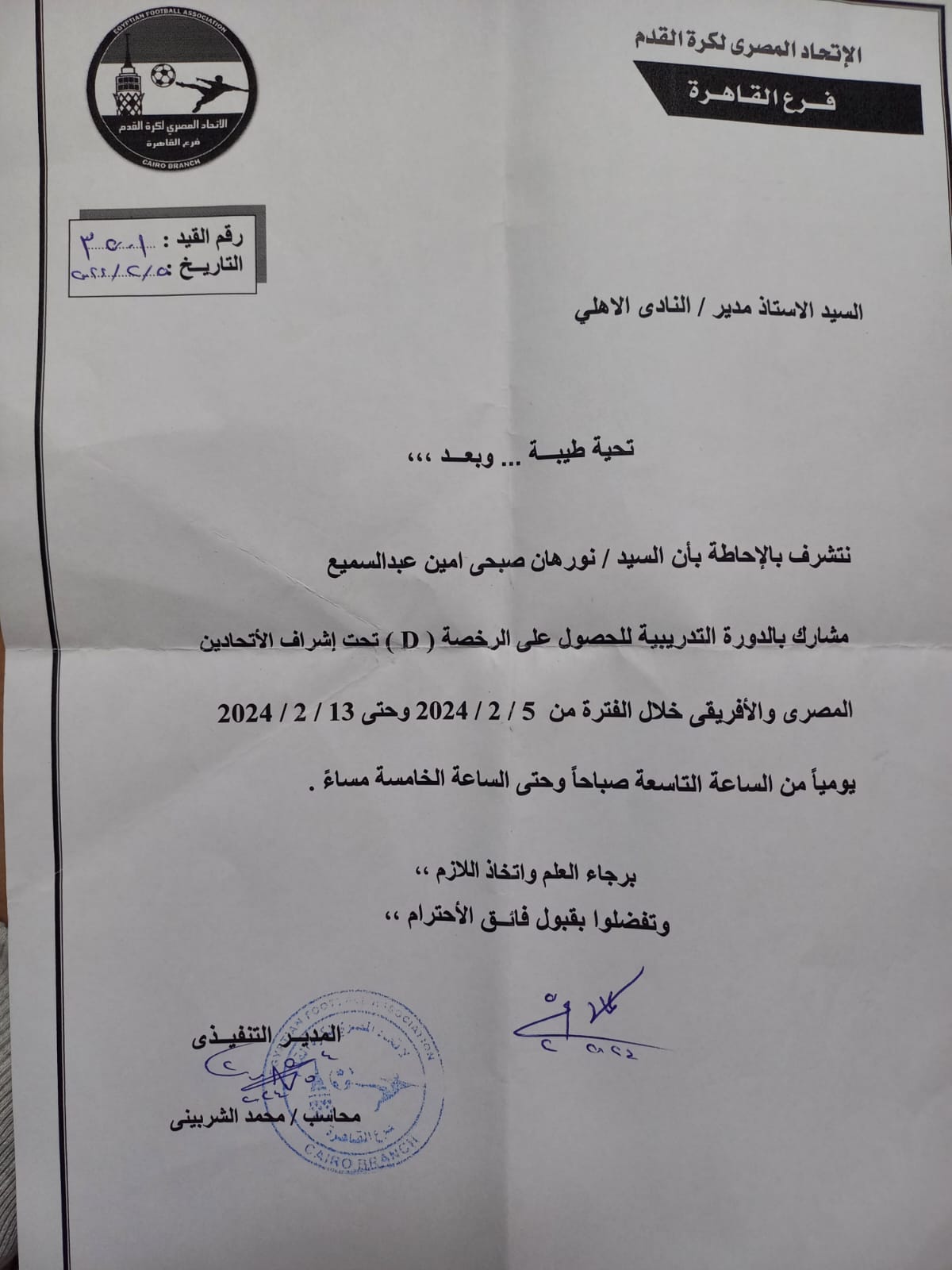 وتابعت: ده ظلم فكيف يتم وضع اسم شخص آخر لم يحضر منذ بداية الدورة التدريبية، وأنا لمجرد غياب يوم واحد فقط لدفن أخي يتم حذف اسمي مع العلم إني حضرت أول يوم للكورس وهو يوم الاثنين ثم الثلاثاء، ولم أحضر يوم الأربعاء لوفاة أخي، ويوم الخميس تم تأجيل الكورس لإقامة مباراة ودية لفريق اتحاد الشرطة التي تقام الدورة على ملعبه، ثم حضرت صباح اليوم الجمعة ليتم التعامل معي بمنتهى الظلم ولا أعرف ما السبب ؟.