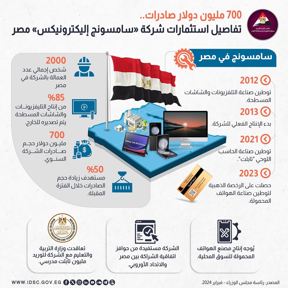 نشرت الصفحة الرسمية لمركز المعلومات ودعم اتخاذ القرار بمجلس الوزراء على موقع التواصل الاجتماعي فيسبوك إنفوجراف جديدا تحت عنوان (700 مليون دولار صادرات.. تفاصيل استثمارات شركة "سامسونج إليكترونيكس" في مصر).