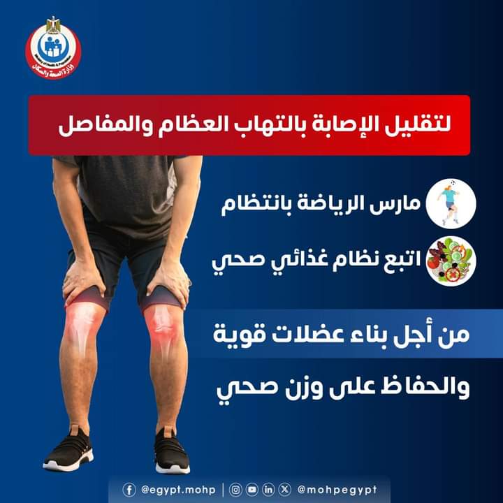 وجهت وزارة الصحة نصائح للحماية من التهاب المفاصل والعظام منها ممارسة الرياضة بانتظام وكذلك اتباع نظام غذائي صحي.