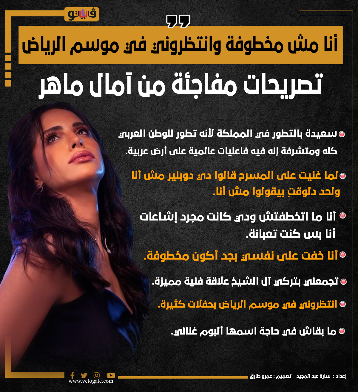 أنا مش مخطوفة وانتظروني في موسم الرياض.. تصريحات مفاجئة من آمال ماهر (إنفوجراف) السبت 10/فبراير/2024 - 01:16 ص 2/10/2024 1:16:20 AM آمال ماهر، فيتو سارة عبد المجيد تصميم :عمرو طارق شارك طباعة 18 حجم الخط شارك طباعة تركي آل الشيخ امال ماهر موسم الرياض