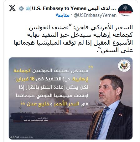 وقال السفير الأمريكي لدى اليمن ستيفن فاجن، مساء الجمعة في بيان على حساب السفارة بمنصة "إكس": إن "تصنيف جماعة الحوثي كـ"جماعة إرهابية" سيدخل حيز التنفيذ نهاية الأسبوع المقبل (16 فبراير الجاري)".