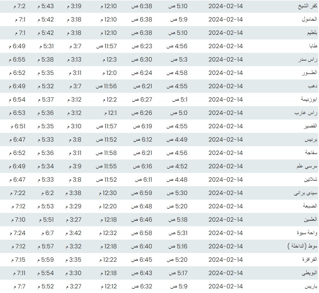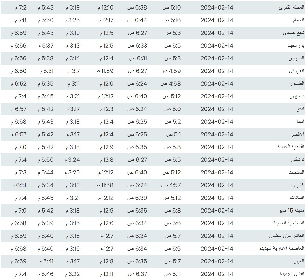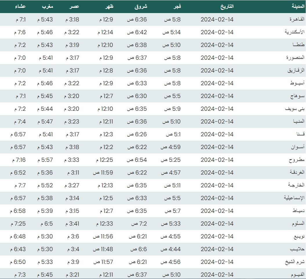 وفيما يلي مواقيت الصلاة، لعدد من مدن ومحافظات الجمهورية من واقع بيانات الهيئة العامة للمساحة