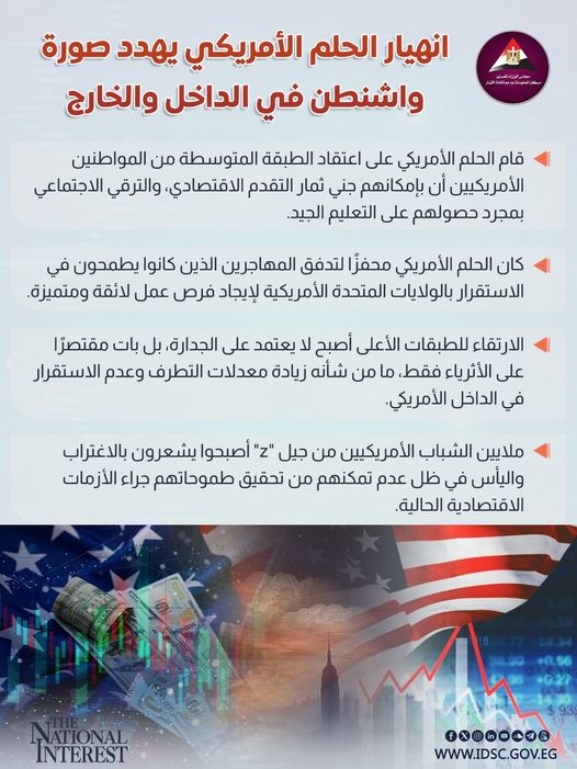 يأتي ذلك بعد أن سلط مقال نشرته مجلة "ذا ناشيونال إنترست" الضوء على انتهاء فكرة "الحلم الأمريكي" الذي كان يُعد أساسًا لنهضة الولايات المتحدة الأمريكية في الداخل والخارج.