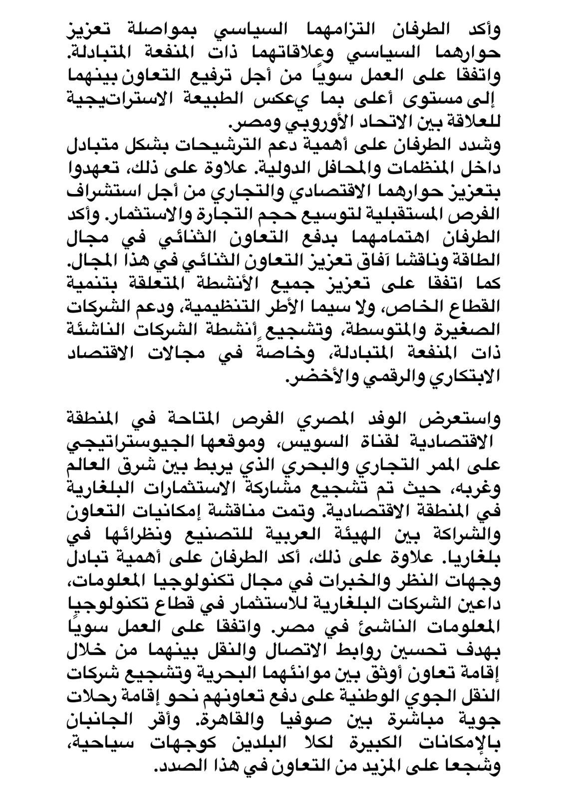 وأوضح المتحدث الرسمي باسم وزارة الخارجية السفير أحمد أبو زيد أن هناك علاقات متميزة وروابط وثيقة لدفع أوجه التعاون المختلفة في شتى المجالات بين مصر وبلغاريا.