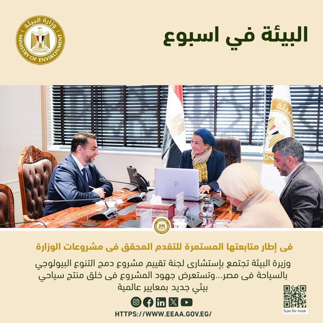 " وزيرة البيئة تجتمع باستشاري لجنة تقييم مشروع دمج التنوع البيولوجي بالسياحة فى مصر فى إطار متابعتها المستمرة للتقدم المحقق فى مشروعات الوزارة"