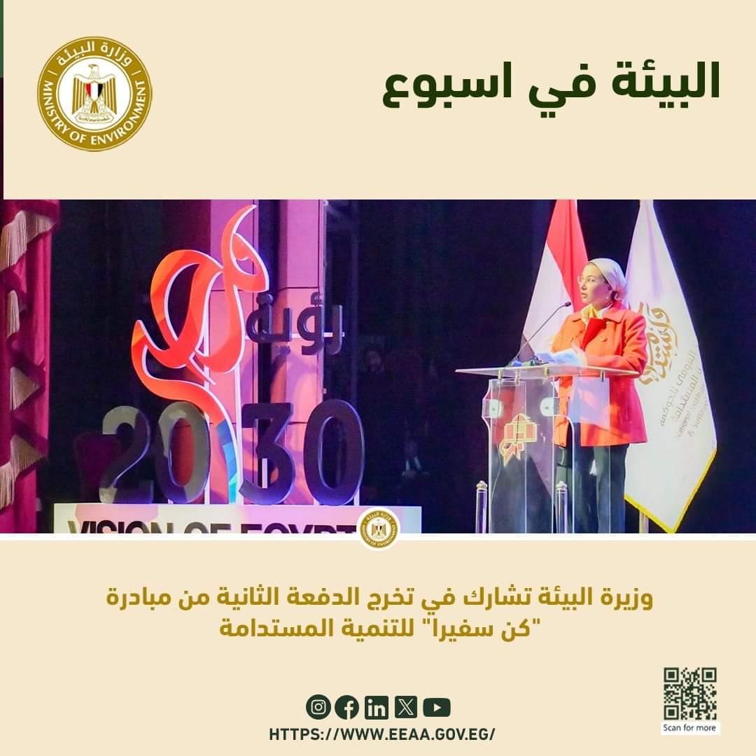 شاركت الدكتورة ياسمين فؤاد وزيرة البيئة، تشارك في حفل تخرج الدفعة الثانية من مبادرة "كن سفيرا" للتنمية المستدامة، بحضور الدكتورة هالة السعيد وزيرة التخطيط والتنمية الاقتصادية، وذلك في إطار بناء القدرات وخاصة الشباب لتحقيق أهداف التنمية المستدامة، من خلال برنامج تدريبي ينفذه المعهد القومي للحوكمة والتنمية المستدامة، بهدف بناء القدرات الوطنية للشباب من عمر 18 حتى 35 عامًا، في مجال التنمية المستدامة من خلال سلسلة من الدورات التدريبية لمختلف القطاعات بالتعاون مع مختلف الجهات المعنية.