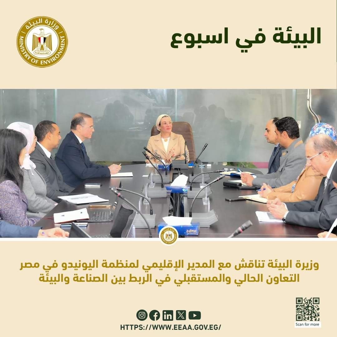 " وزيرة البيئة تناقش مع المدير الإقليمي لمنظمة اليونيدو في مصر التعاون الحالي والمستقبلي في الربط بين الصناعة والبيئة ٤٥ مليون دولار لمشروعات البيئة من إجمالي ٥٤ مليون دولار حزمة اليونيدو في مصر"