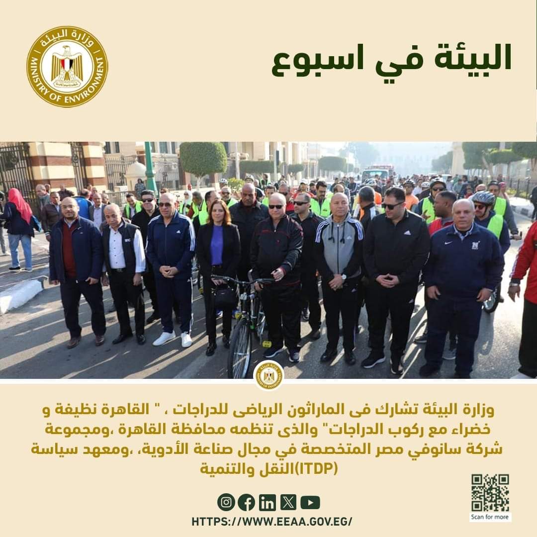 شاركت وزارة البيئة فى الماراثون الرياضى للدراجات، " القاهرة نظيفة وخضراء مع ركوب الدراجات" والذى تنظمه محافظة القاهرة،ومجموعة شركة سانوفي مصر المتخصصة في مجال صناعة الأدوية،،ومعهد سياسة النقل والتنمية (ITDP)، وذلك بمشاركة اللواء خالد عبد العال محافظ القاهرة ووفد من السادة المسؤولين رفيعي المستوي، من أصحاب المصلحة الرئيسيين في مجال التنقل المستدام وكذلك بمشاركة فريق من مبادرة جو بايك (Go Bike) وعددا من المبادرات الشبابية الأخرى. وقد أشادت الدكتورة ياسمين فؤاد، وزيرة البيئة، بالحدث والذى يساهم في الحفاظ على البيئة والتصدي لآثار التغيرات المناخية من خلال اللجوء إلى استخدام الدراجات كبديل عن السيارات ووسائل النقل الأخرى الملوثة للبيئة في المسافات القصيرة، كما تسعى الوزارة إلى تشجيع استخدام الدراجات كبديل لوسائل النقل التقليدية المستهلكة للوقود، حيث نفذت من خلال مشروع النقل المستدام التابع لها عدد من مسارات الدراجات للتشجيع على استخدامها، كأدوات مواجهة تلوث الهواء والتغيرات المناخية من خلال تقليل استخدام السيارات وترشيد استهلاك الطاقة. لافتة إلى استمرار التعاون مع شركة سانوفى مصر خلال الفترة القادمة حيث سيتم تنفيذ المرحلة الثانية من مسابقة " صحتنا من صحة كوكبنا اتحضر للأخضر" بالتعاون مع المجلس الأعلى للجامعات، وتستهدف تلك المرحلة طلبة الجامعات حيث تم تحديد عدد ٧ جامعات مستضيفة، ومشاركة عدد ٢٠ جامعة، وسيتم تنفيذ عدد من الأنشطة الرياضية والتوعوية، وتوزيع عدد (۱۰۰۰) دراجة هوائية على ان يتم البدء بجامعات اسيوط واسوان والاقصر وسوهاج وجنوب الوادى، والوادى الجديد، وستكون جامعة اسيوط هى الجامعة المستضيفة.وقد انطلقت فعاليات الماراثون من مبني محافظة القاهرة وخلال الجولة قام قائدى الدراجات بتجربة واختبار عدة امتدادات من ممرات الدراجات التي تم تنفيذها مؤخرًا على بعد ٢ كيلومترات في منطقة وسط البلد.