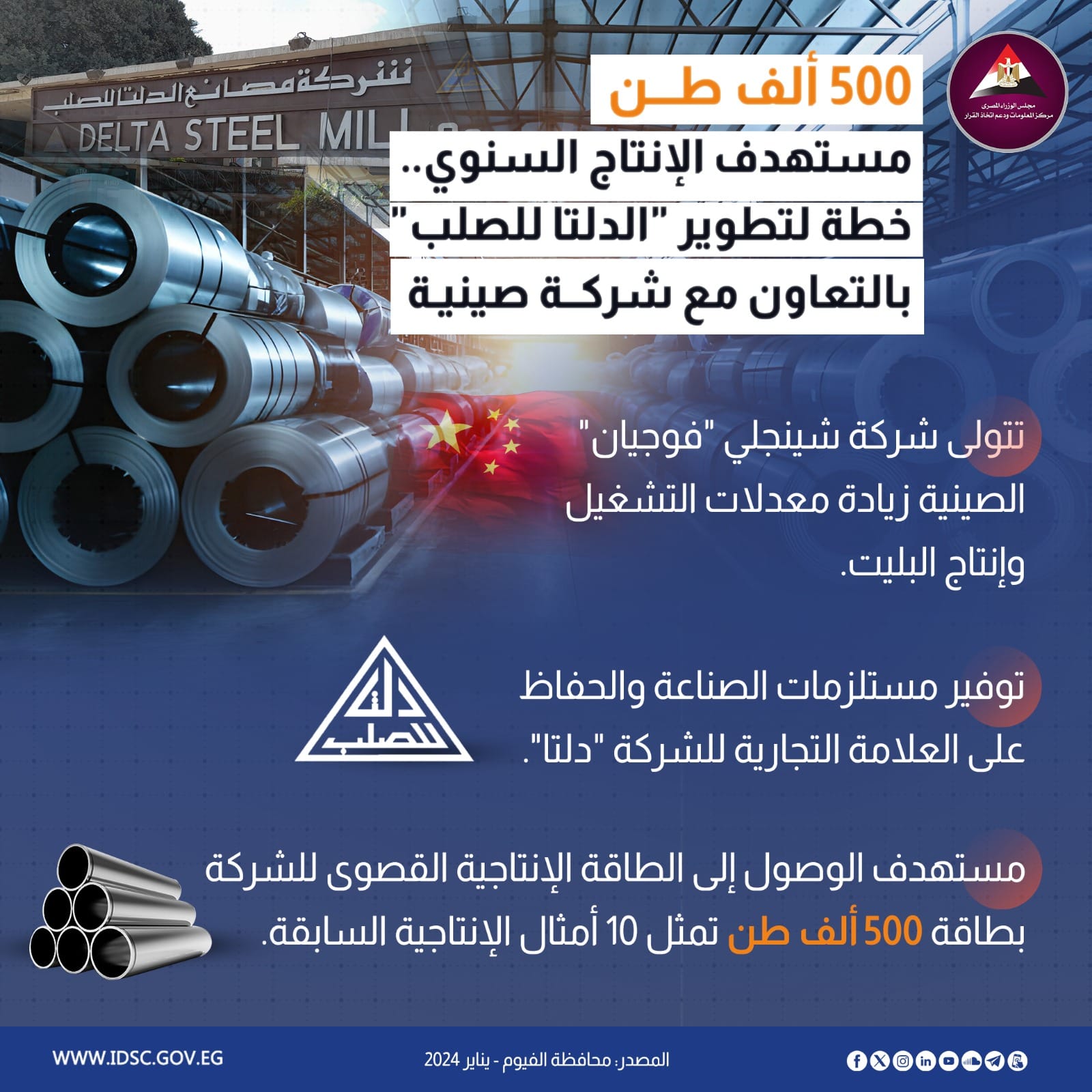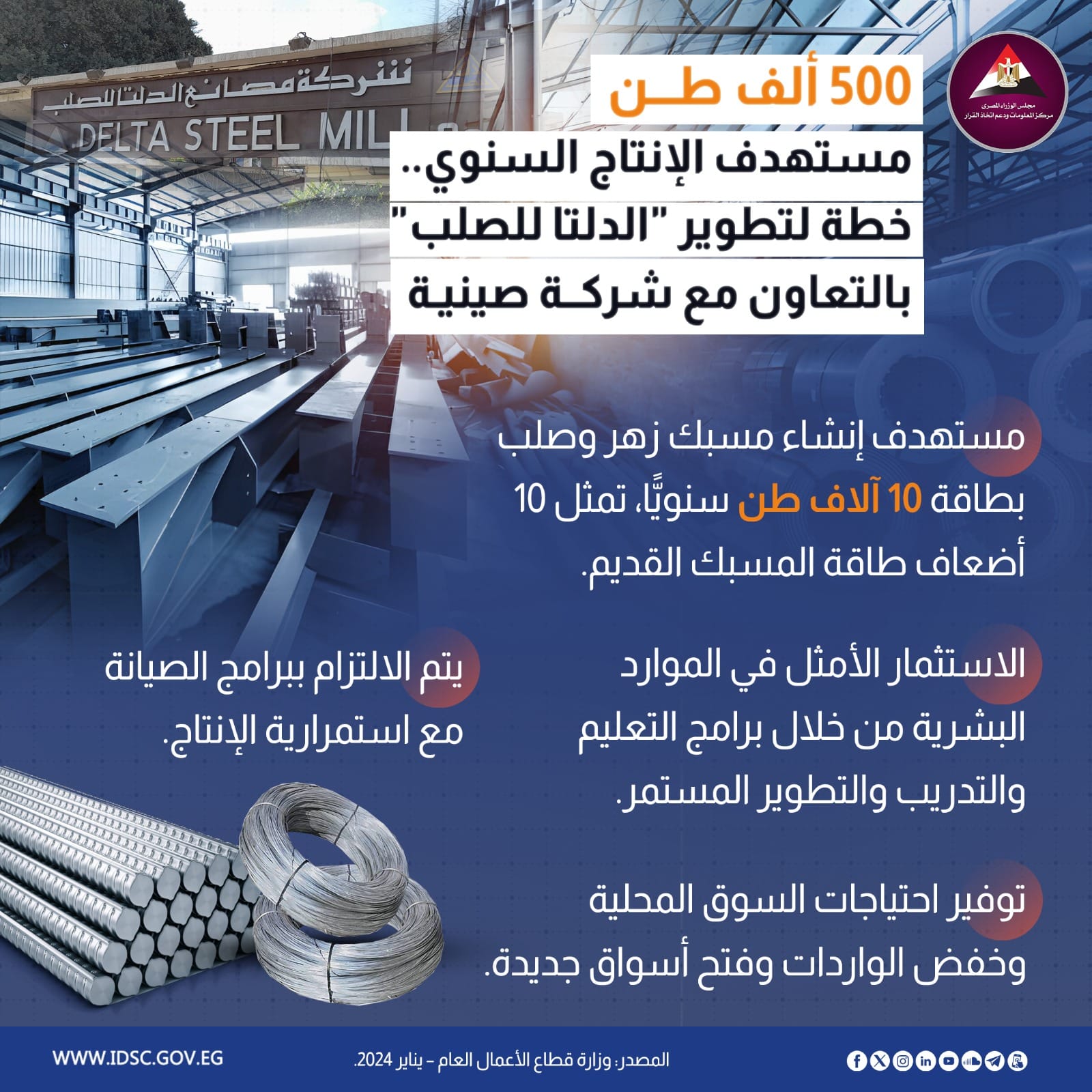 نشرت الصفحة الرسمية لمركز المعلومات ودعم اتخاذ القرار بمجلس الوزراء على موقع التواصل الاجتماعي فيسبوك إنفوجراف جديدا تحت عنوان (500 ألف طن مستهدف الإنتاج السنوي.. خطة لتطوير الدلتا للصلب بالتعاون مع شركة صينية).