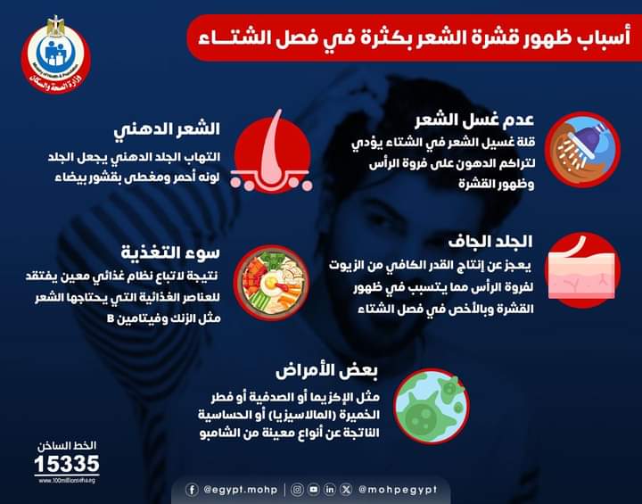 وجهت وزارة الصحة عدة نصائح للتخلص من قشرة الرأس في موسم الشتاء، حيث أوصت بضرورة اتباع هذه التعليمات، منها: