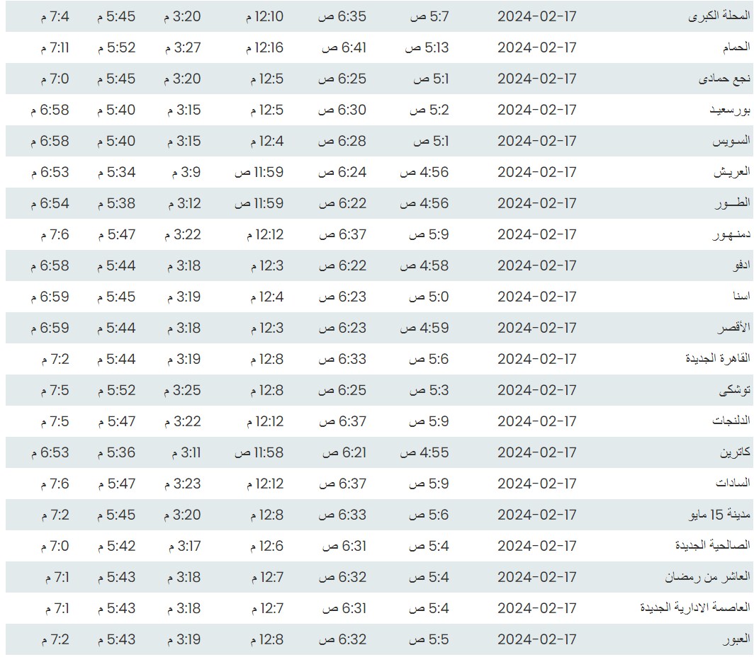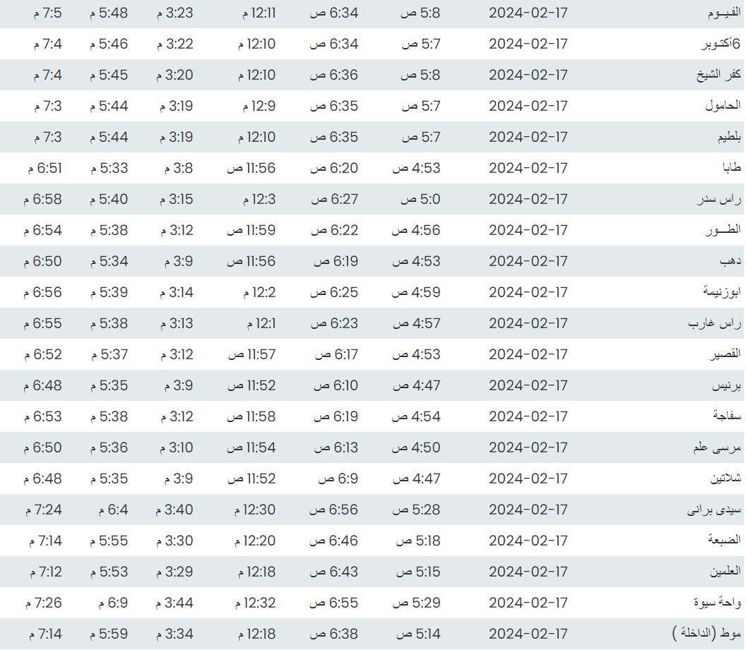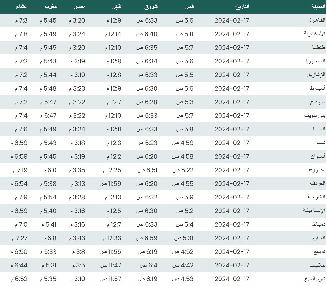 وفيما يلي مواقيت الصلاة، لعدد من مدن ومحافظات الجمهورية من واقع بيانات الهيئة العامة للمساحة