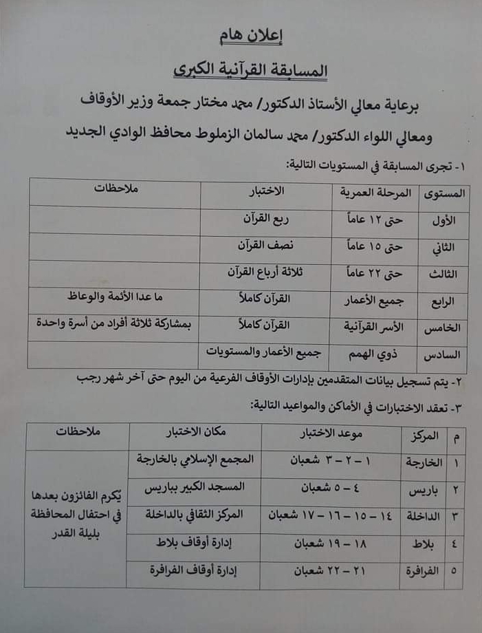 بالمسجد الكبير بباريس، ومركز الداخلة أيام 14 - 15 - 16 - 17 شعبان المركز الثقافي بالداخلة، وفي مركز ومدينة بلاط أيام 18 – 19 شعبان بإدارة أوقاف بلاط، وأيام 21 – 22 شعبان لأبناء مركز ومدينة الفرافرة بإدارة أوقاف الفرافرة، لافتًا إلى أنه سيتم أيضًا تكريم الفائزين في احتفال محافظة الوادي الجديد بليلة القدر.
