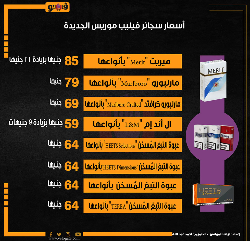 أسعار سجائر فيليب موريس الجديدة (إنفوجراف) الأحد 11/فبراير/2024 - 05:38 م 2/11/2024 5:38:44 PM أسعار سجائر فيليب موريس الجديدة، فيتو آيات موافي شارك طباعة 18 حجم الخط شارك طباعة