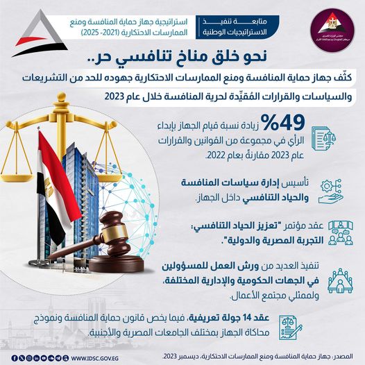 وفي هذا السياق، اعتمدت الدولة المصرية على استراتيجية جهاز حماية المنافسة ومنع الممارسات الاحتكارية (2021-2025)، والتي تتماشى مع أهداف التنمية المستدامة ورؤية مصر 2030، وقد خصصت الاستراتيجية الهدف الأول منها للإنفاذ الفعَّال لأحكام قانون حماية المنافسة، والهدف الثاني للحد من التشريعات والسياسات والقرارات المُقيِّدة لحرية المنافسة، بما يضمن تنافسية الأسواق لصالح المواطنين والكيانات الاقتصادية والاقتصاد القومي.