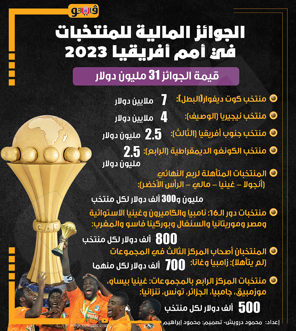 الجوائز المالية للمنتخبات في أمم أفريقيا 2023 (إنفوجراف) الإثنين 12/فبراير/2024 - 05:35 م 2/12/2024 5:35:59 PM كأس الأمم الأفريقية، فيتو محمود درويش شارك طباعة 18 حجم الخط شارك طباعة منتخب كوت ديفوار منتخب نيجيريا منتخب جنوب أفريقيا منتخب الكونغو الديمقراطية كاس الأمم الإفريقية