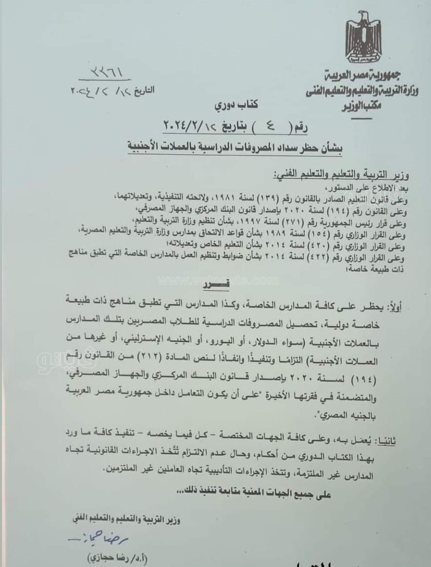 كما أصدر الدكتور رضا حجازى وزير التربية والتعليم والتعليم كتابا دوريا رقم 4 لسنة 2024 بتاريخ 12 فبراير الجارى، وجاء نصه كالتالى: بشأن حظر سداد المصروفات الدراسية بالعملات الأجنبية بعد الاطلاع على الدستور وعلى قانون التعليم الصادر بالقانون رقم 139 لسنة 1981 ولائحته التنفيذية، وتعديلاتهما، وعلى القانون رقم 194 لسنة 2020 بإصدار قانون البنك المركزي والجهاز المصرفي، وعلى قرار رئيس الجمهورية رقم 271 لسنة 1997، بشأن تنظيم وزارة التربية والتعليم. وعلى القرار الوزاري رقم 154 لسنة 1989 بشأن قواعد الالتحاق بمدارس وزارة التربية والتعليم المصرية، وعلى القرار الوزاري رقم 420 لسنة 2014 بشأن التعليم الخاص وتعديلاته وعلى القرار الوزاري رقم 422 لسنة 2014 بشأن ضوابط وتنظيم العمل بالمدارس الخاصة التي تطبق مناهج ذات طبيعة خاصة.. تقرر: