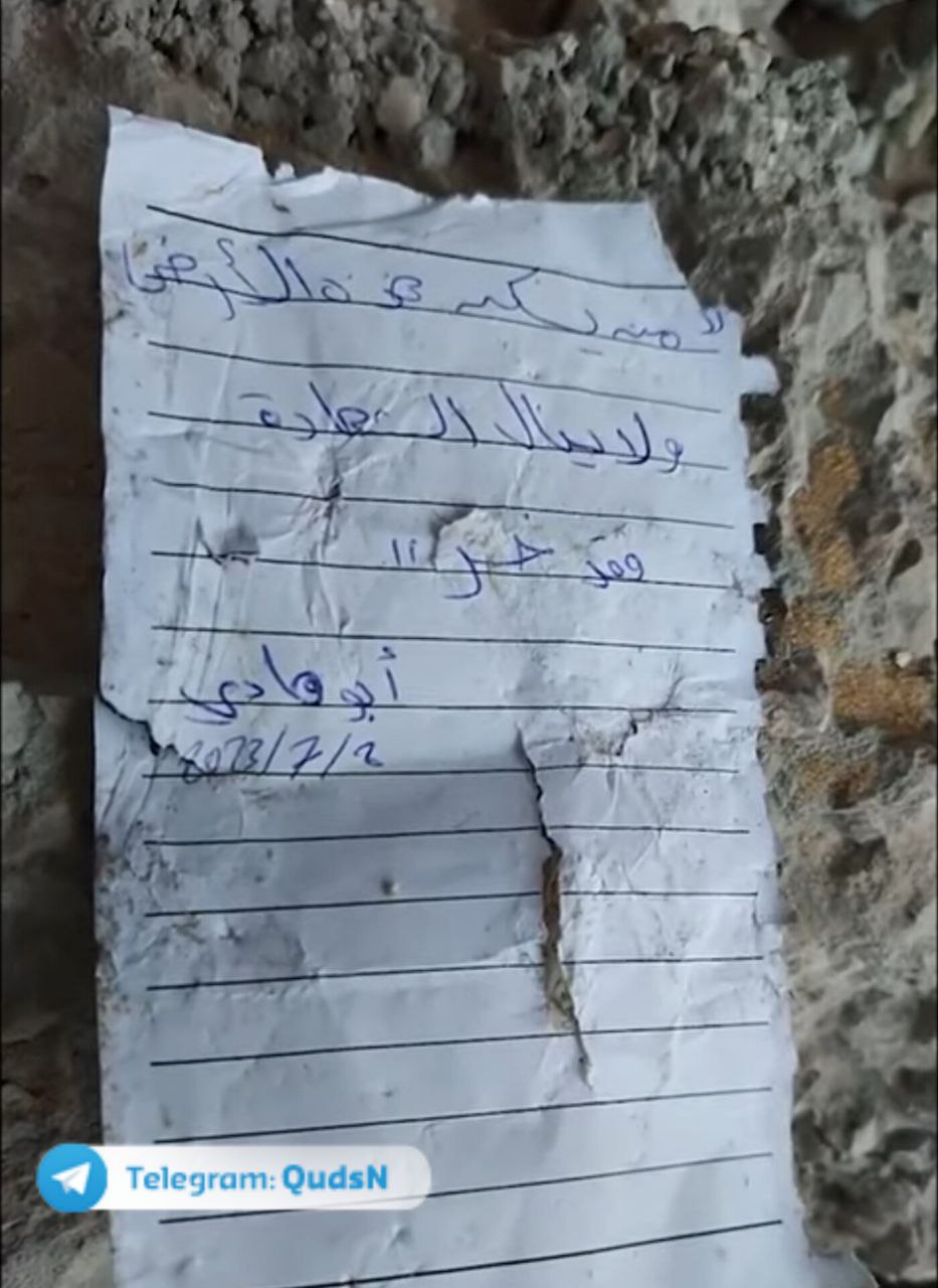 كما تداول النشطاء ورقة لشهيد فلسطيني كتبها كتبها قبل استشهاده جراء قصف الاحتلال الصهيوني لمنزله في قطاع غزة وكتب فيها:" من يسكن هذه الأرض ولا ينال الشهادة فقد خسر".