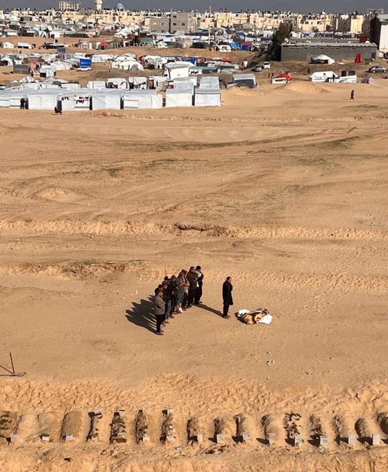 وشارك حساب “عمار” صورة لمجموعة من الفلسطينيين يصلون في منطقة صحراوية مكشوفة قرب رفح وأرفقها بتعليق: “الخيام في رفح يحدُّها من الجنوب قبور الضحايا ومن الشمال موتٌ قادم”.