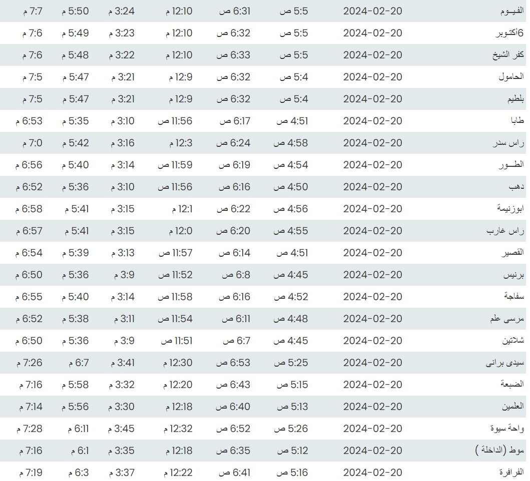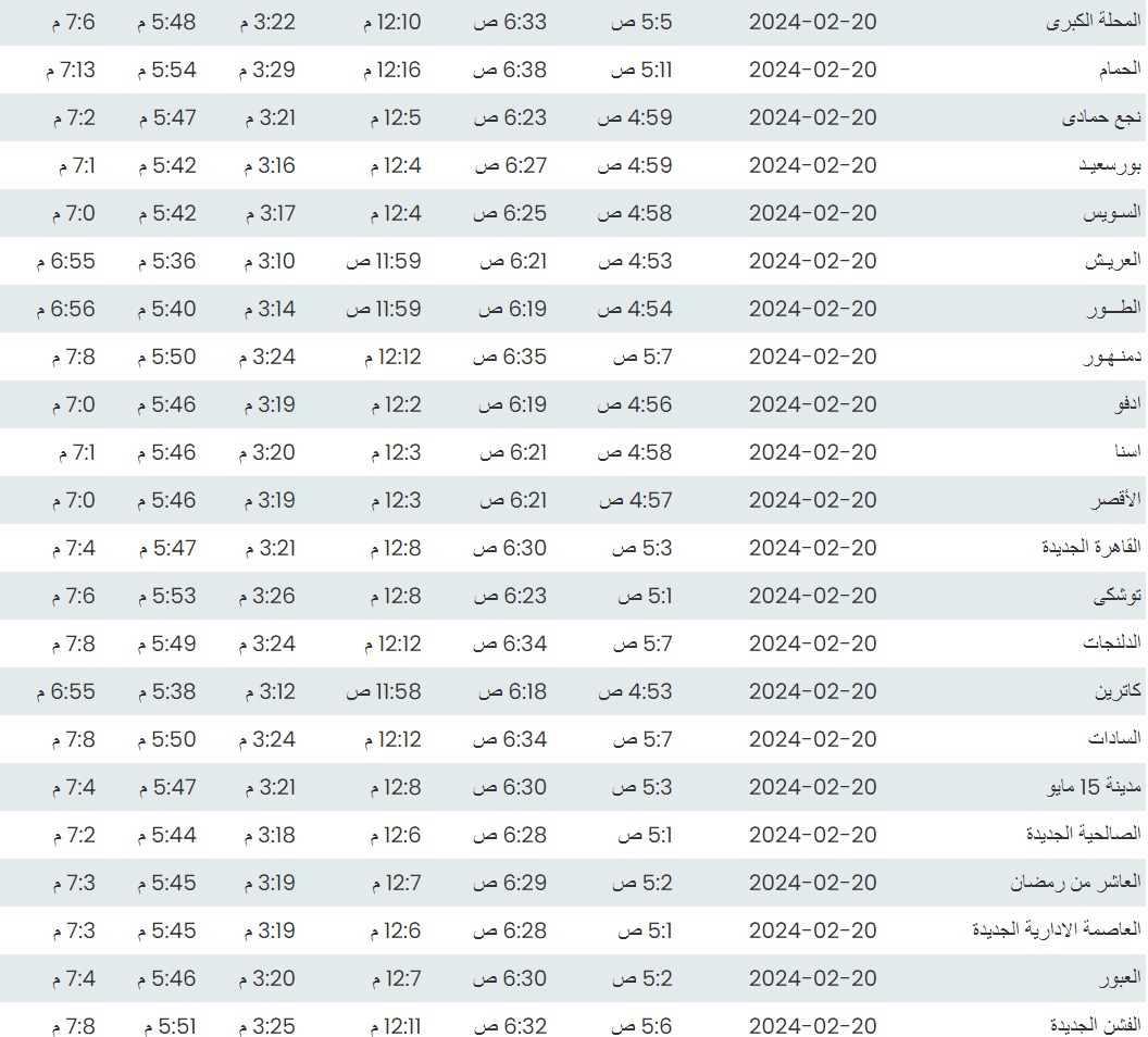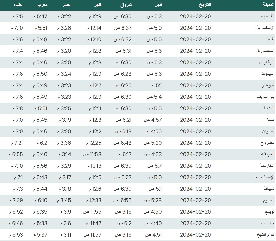 وفيما يلي مواقيت الصلاة، لعدد من مدن ومحافظات الجمهورية من واقع بيانات الهيئة العامة للمساحة