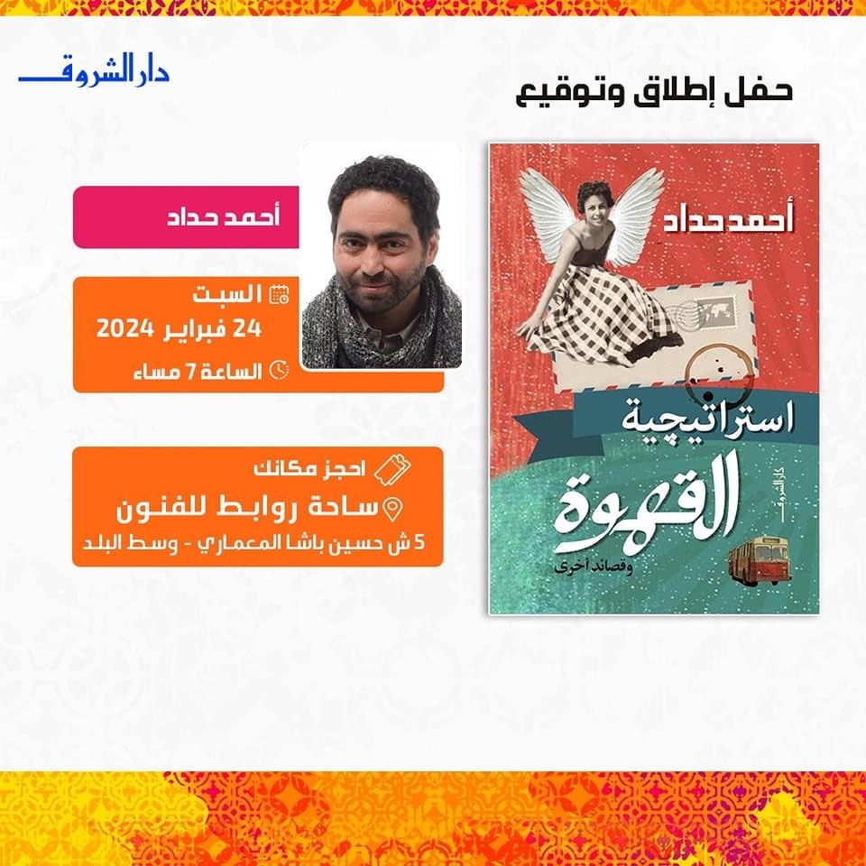 تنظم دار الشروق للنشر والتوزيع، حفل إطلاق لديوان "استراتيجية القهوة" للشاعر أحمد حداد، وذلك في تمام السابعة من مساء يوم السبت الموافق 24 فبراير الجاري، بساحة روابط للفنون بوسط القاهرة.