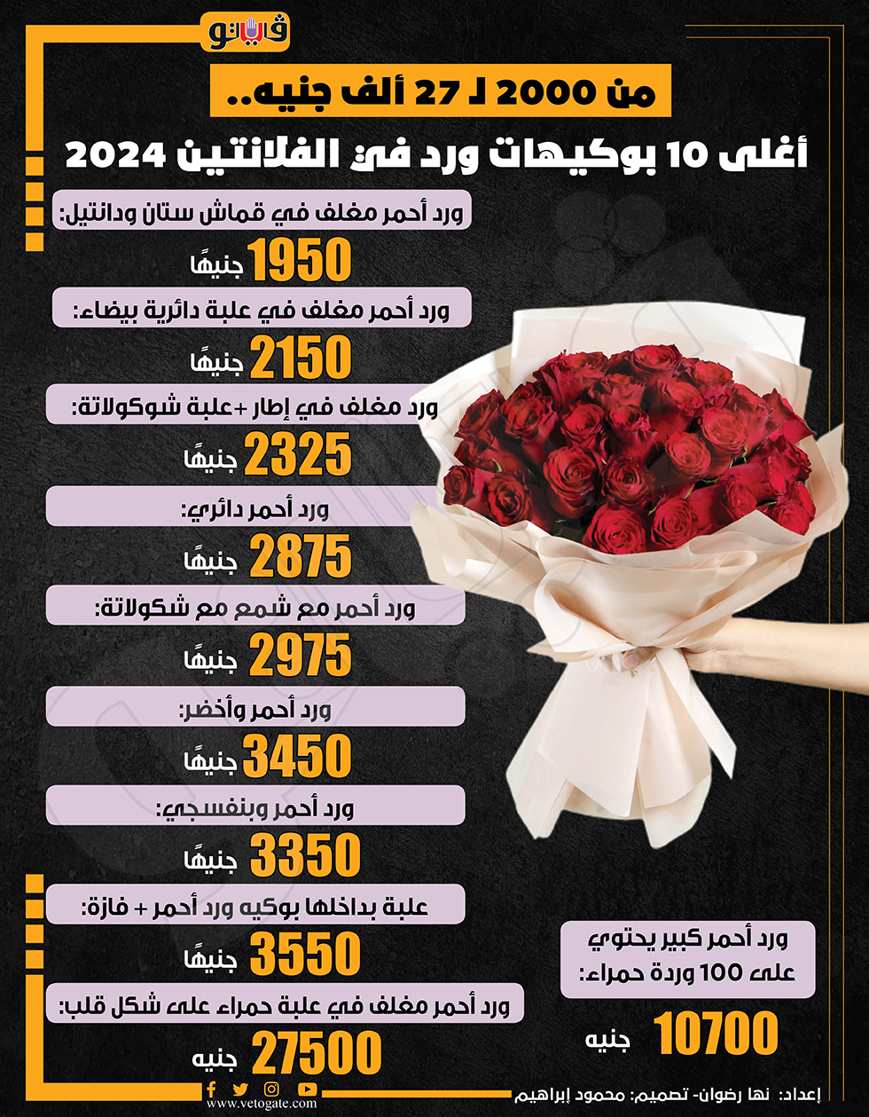 من 2000 لـ 27 ألف جنيه.. أغلى 10 بوكيهات ورد في الفلانتين 2024 (إنفوجراف) الثلاثاء 13/فبراير/2024 - 10:00 م 2/13/2024 10:00:03 PM بوكيهات الورد في عيد الحب، فيتو نها رضوان الاء زين شارك طباعة 18 حجم الخط شارك طباعة عيد الحب 2024 أسعار الورد في عيد الحب ورد الفلانتين سعر الزهور سعر بوكيه الورد