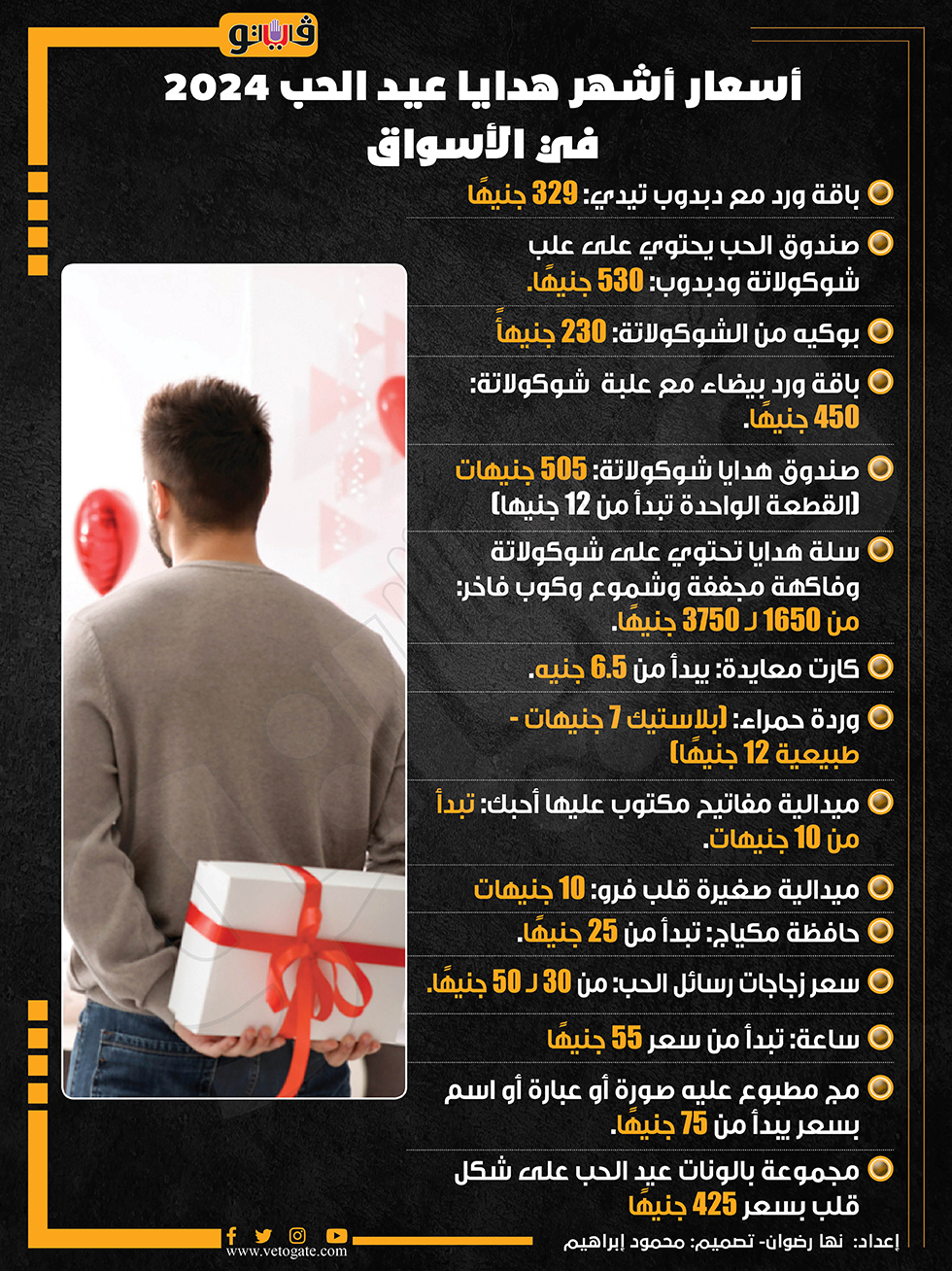 أسعار أشهر هدايا عيد الحب 2024 في الأسواق (إنفوجراف) الثلاثاء 13/فبراير/2024 - 05:00 م 2/13/2024 5:00:15 PM هدايا عيد الحب 2024، فيتو نها رضوان شارك طباعة 18 حجم الخط شارك طباعة أسعار هدايا عيد الحب 2024 عيد الحب 2024 الفلانتين 2024 هدايا الفلانتين سعر هدايا الفلانتين عيد الحب