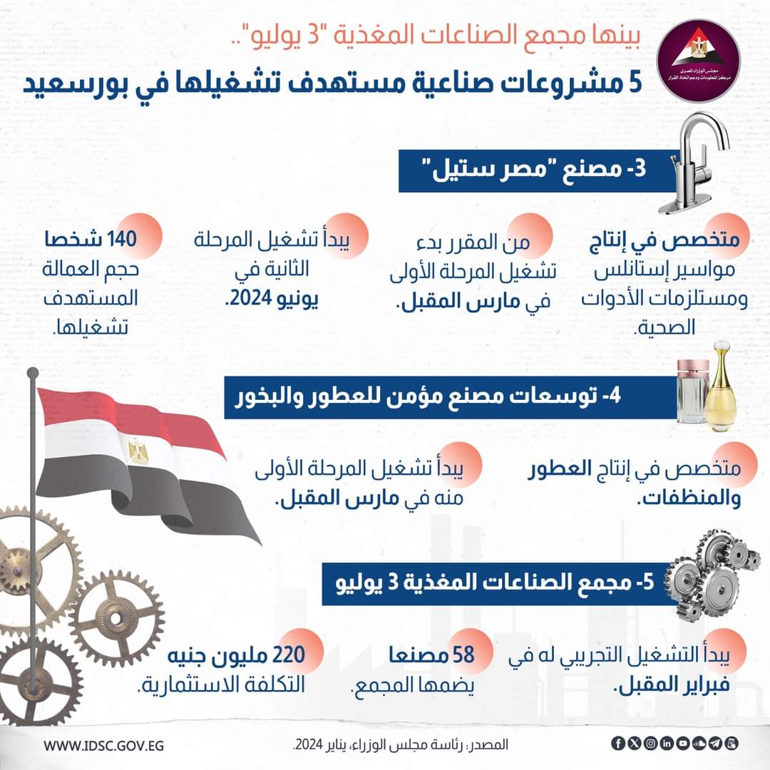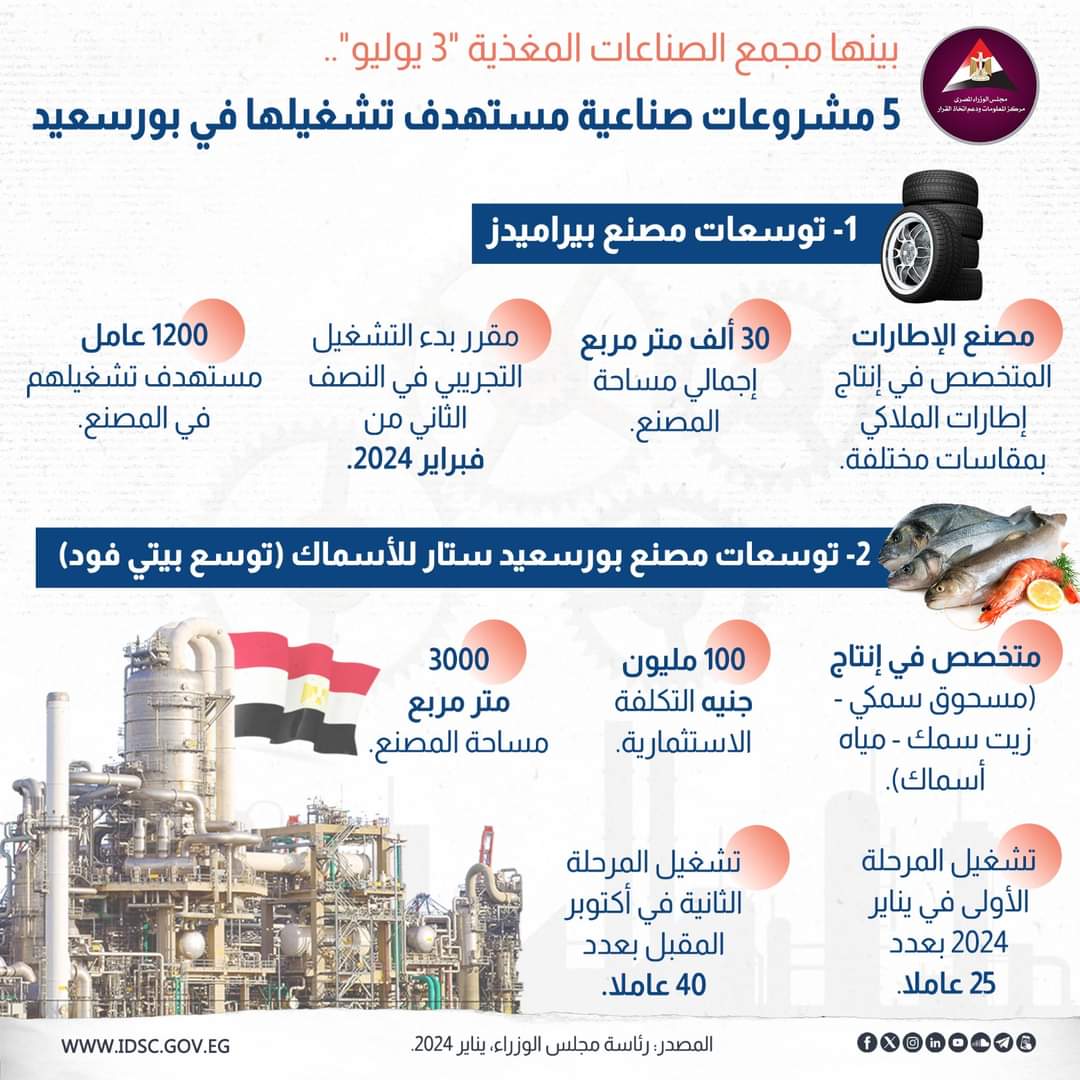 نشرت الصفحة الرسمية لمركز المعلومات ودعم اتخاذ القرار بمجلس الوزراء على موقع التواصل الاجتماعي فيسبوك إنفوجراف جديدا تحت عنوان (بينها مجمع الصناعات المغذية 3 يوليو..5 مشروعات صناعية مستهدف تشغيلها في بورسعيد)
