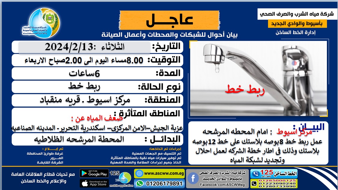 نوهت شركة مياه الشرب والصرف الصحي بأسيوط والوادي الجديد عن ضعف المياه انقطاعها لمدة 6 ساعات متواصلة بمنطقة قرى بحري مركز أسيوط التي تضم ( عزبة الجيش ؛ اسكندرية التحرير ؛ المدينة الصناعية ببني غالب ؛ الامن المركزي ) بالأدوار العليا وذلك حتى اتمام أعمال الإحلال والتجديد لشبكات المياه.