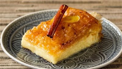 ثم يرفع ويسقى بالشربات البارد ويزين بالقرفة، ويقطع مثلثات ويقدم بالهنا.