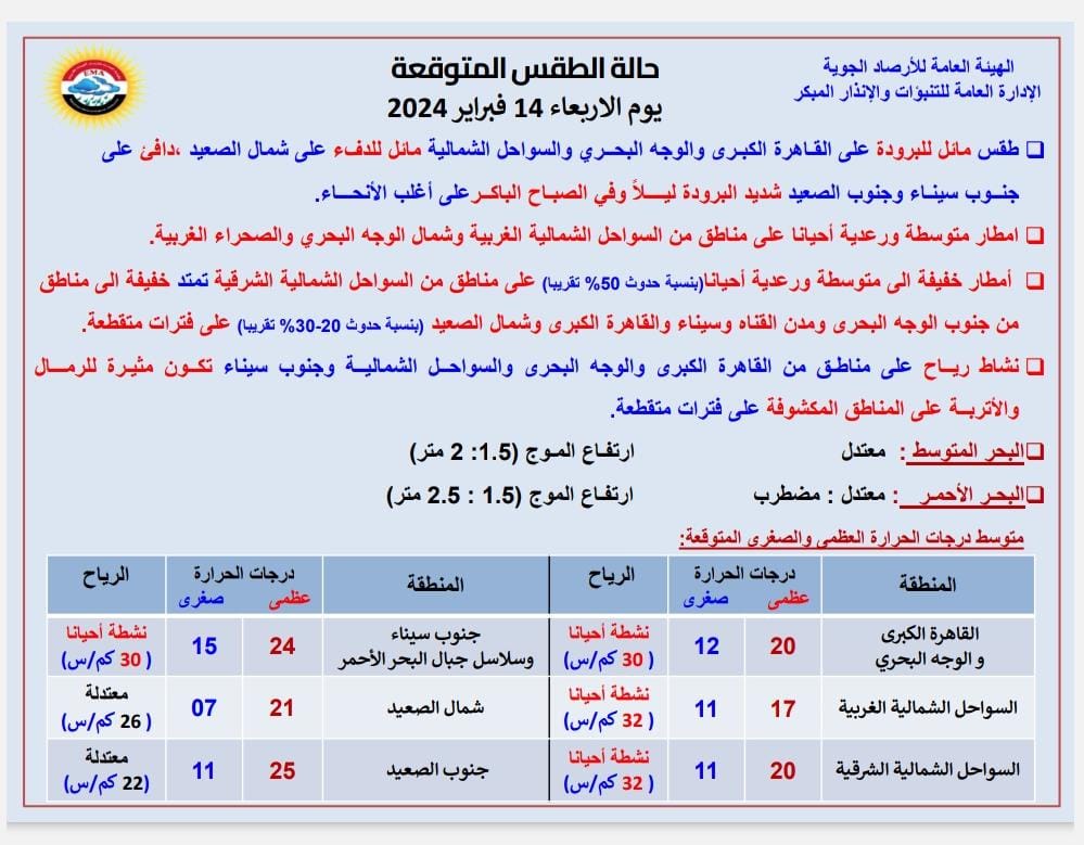 وعن نشاط الرياح أكدت هيئة الأرصاد الجوية أنه من المتوقع أن تنشط الرياح على مناطق من القاهرة الكبرى والوجه البحري والسواحل الشمالية وجنوب سيناء وتكون مثيرة للرمال والأتربة على المناطق المكشوفة على فترات متقطعة.