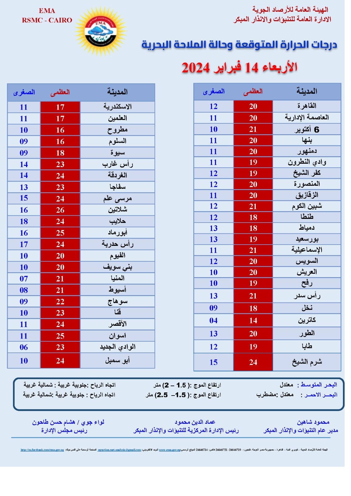 وأعلنت هيئة الأرصاد الجوية بيانًا بدرجات الحرارة وجاءت كالتالي: