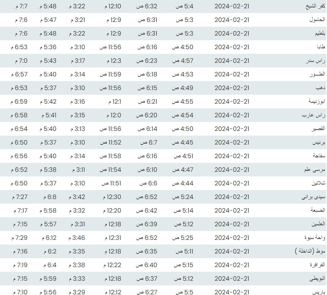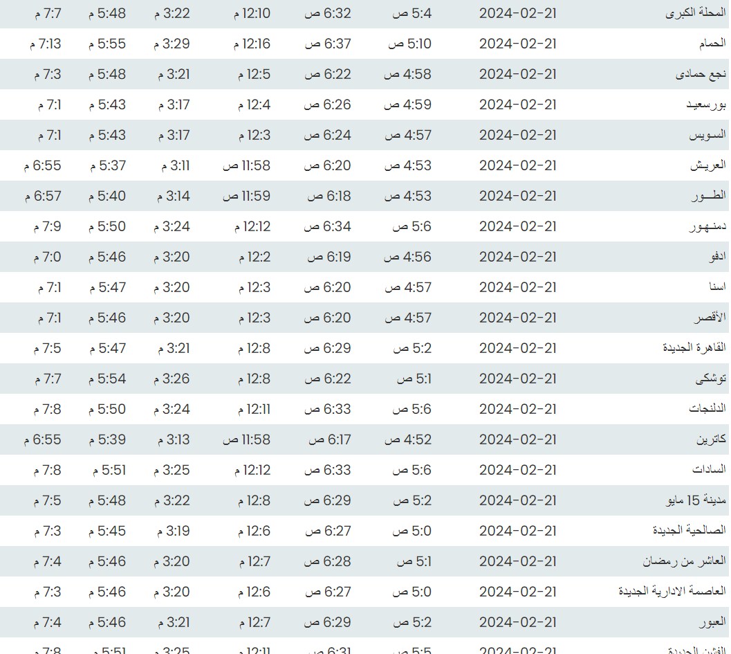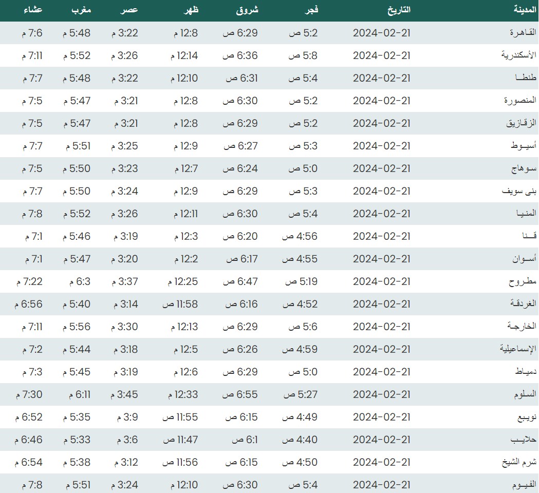 وفيما يلي مواقيت الصلاة، لعدد من مدن ومحافظات الجمهورية من واقع بيانات الهيئة العامة للمساحة