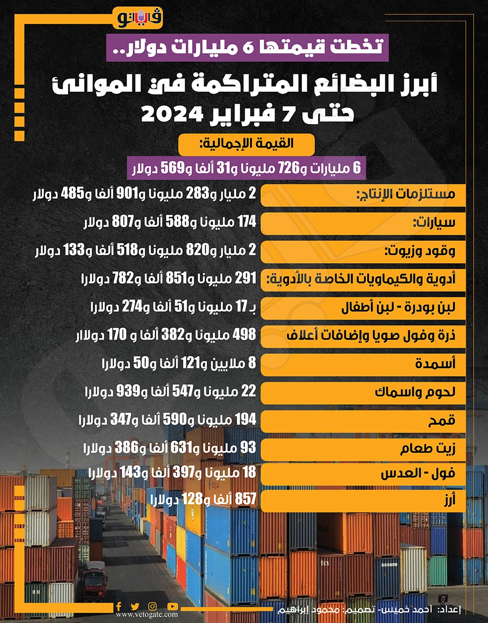 وكشف تقرير إجمالي البضائع المتراكمة بالموانئ البحرية حتى ٠٧-٠٢-٢٠٢٤والذي حصلت فيتو على نسخة منه، وصول إجمالي البضائع المتراكمة بالموانئ البحرية من البضائع غير البترولية والبترولية حتى 7 فبراير إلى 6 مليارات و726 مليونا و31 ألفا و569 دولارا.