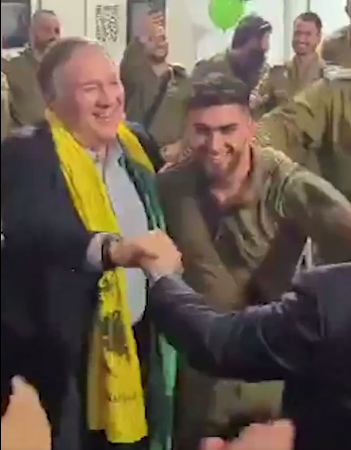 ويظهر مقطع الفيديو المتداول لـ مايك بومبيو، وزير الخارجية الأمريكي السابق، وهو يشارك عددا من جنود الاحتلال الإسرائيلي في احتفالية يقيمها الاحتلال في إحدى مستوطنات غلاف غزة، وأخذ يرقص معهم، وقام أحد جنود الاحتلال بمنح بومبيو راية لواء جولاني، حيث قام بومبيو بارتدائها على الفور، وواصل الرقص مع جنود الاحتلال.