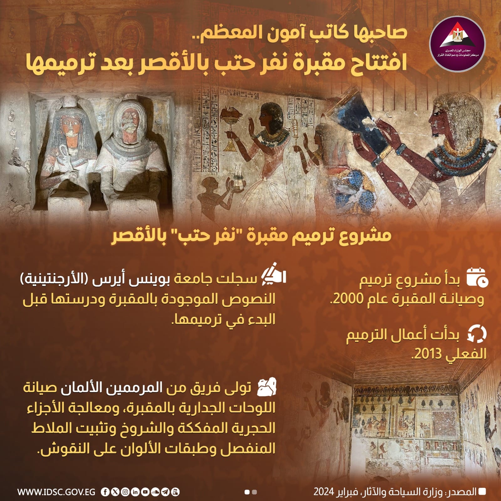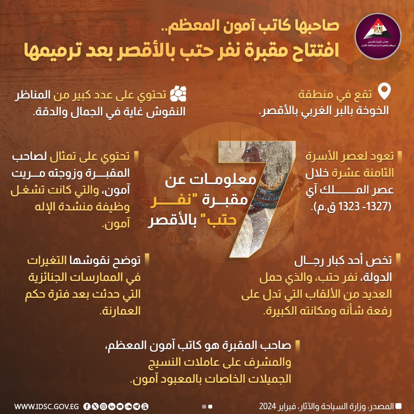 نشرت الصفحة الرسمية لمركز المعلومات ودعم اتخاذ القرار بمجلس الوزراء على موقع التواصل الاجتماعي "فيسبوك" إنفوجرافا جديدا تحت عنوان (صاحبها كاتب آمون المعظم..افتتاح مقبرة نفر حتب بالأقصر بعد ترميمها).