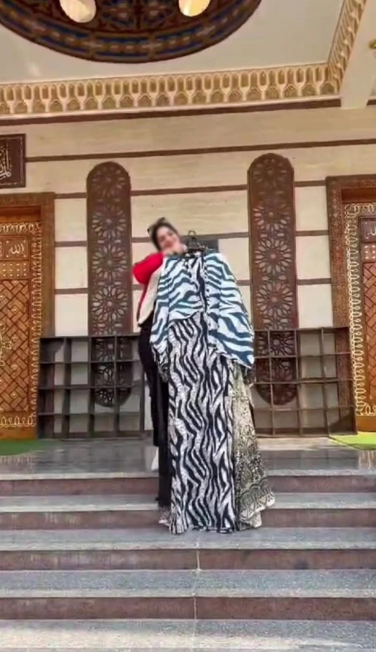 وظهرت مصممة الأزياء، بمقطع الفيديو مرتدية عبايات بألوان مختلفة وحذاء قصيرا باللون الأسود، واقفة على درجات السلالم بمدخل مسجد القنديل الأخضر الكائن بمنطقة الـ77 فدان بشرق النيل "مزرعة الرومي"، في تصوير "صور فوتوغرافية وفيديو" تعرض خلالها منتجاتها من الأزياء النسائية.