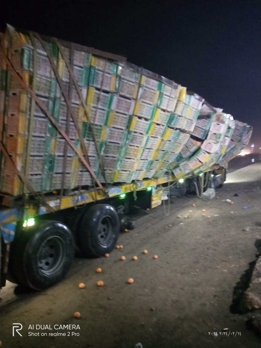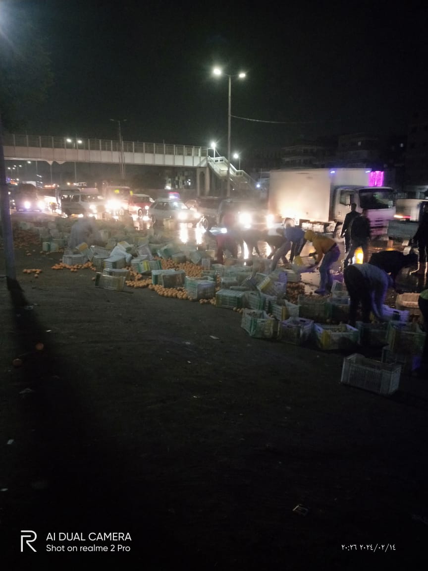 تبين أن حمولة السيارة كميات كبيرة من حمولة البرتقال ، وتوقفت حركة الطريق المتجه إلى مدينة بنها وجار رفع الحمولة وإعادة الحركة المرورية إلى طبيعتها. ولم يسفر الحادث حتى الآن عن وجود مصابين.