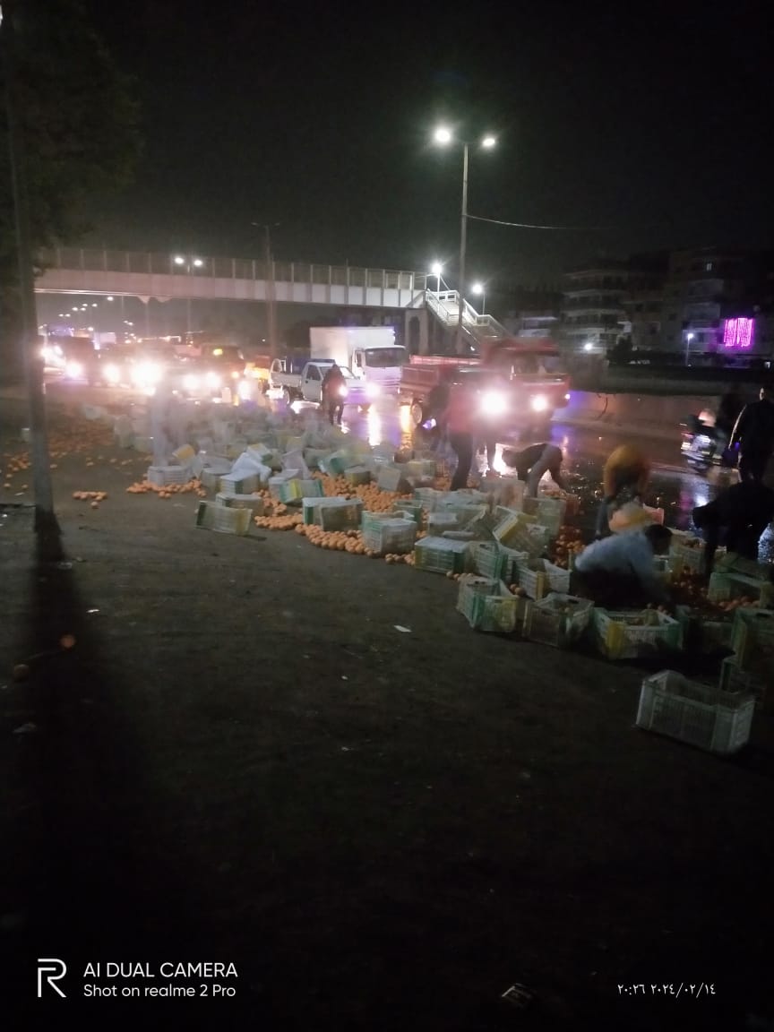 تعطل حركة الطريق الزراعي بعد انقلاب سيارة محملة بالبرتقال (صور)