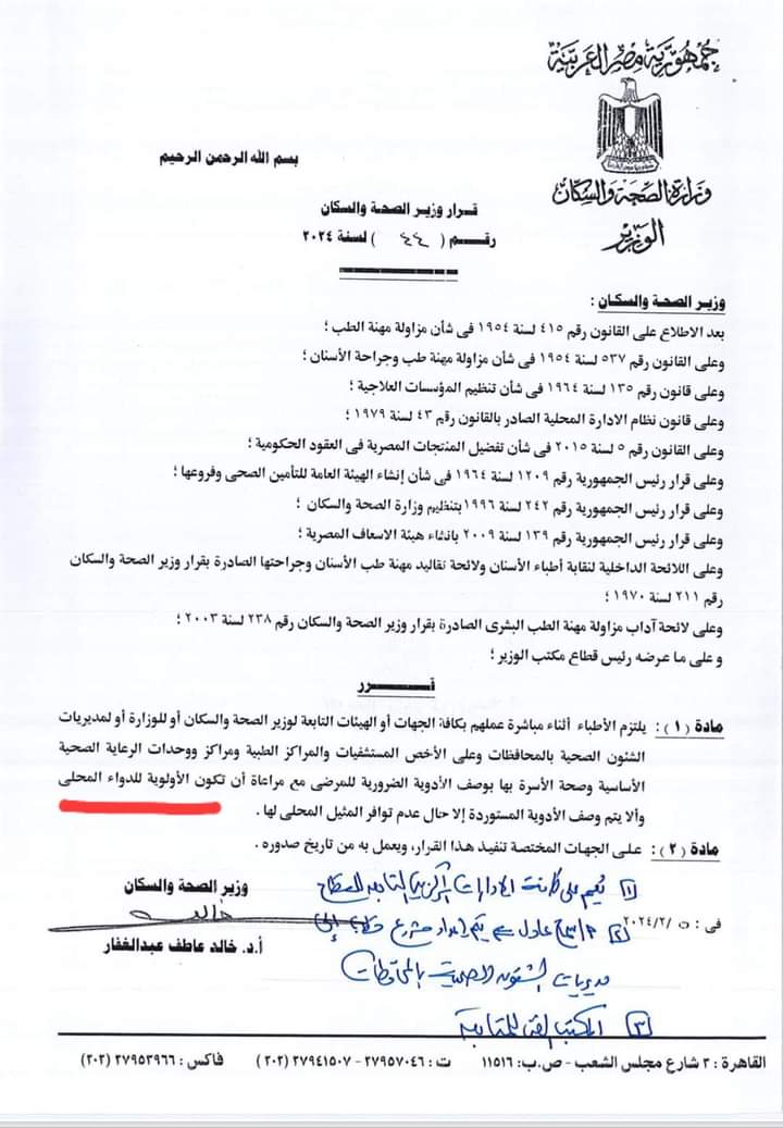 أصدر الدكتور خالد عبدالغفار وزير الصحة والسكان قرارا وزاريا رقم ٤٤ لسنة ٢٠٢٤ تضمن تعليمات وزير الصحة لكل المستشفيات والمراكز الطبية ووحدات الرعاية الصحية بأن يلتزم الأطباء أثناء ممارسة عملهم مباشرة بوصف الأدوية الضرورية للمرضى فقط مع مراعاة أن تكون الأدوية المحلية المصرية وليست المستوردة.